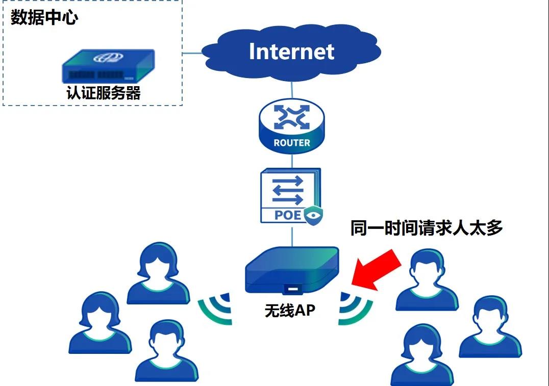 機場、酒店大廳等公共區(qū)域同時間上網(wǎng)的人太多,大量用戶同時申請認證,瞬間流量太大,設(shè)備難以承載。